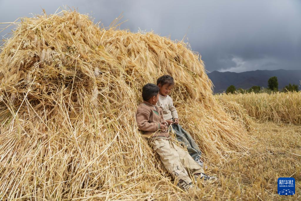 9月10日,在西藏日喀則市白朗縣巴紮鄉(xiang) ,孩子們(men) 靠在青稞垛上玩耍。新華社記者 晉美多吉 攝