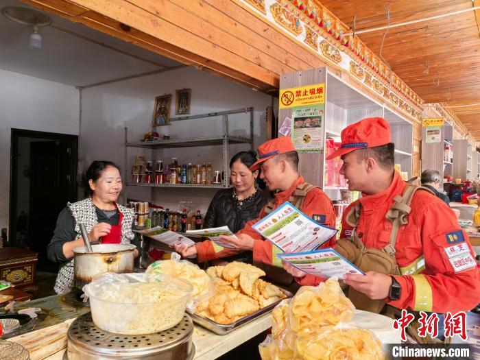 圖為(wei) 消防員前往景區商鋪開展防火宣傳(chuan) 。袁勇斌 攝