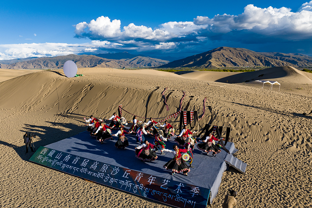 西藏山南首屆“高原沙丘青年藝術季”非遺歌舞展演現場(無人機照片,9月15日攝)。新華網 旦增努布 攝