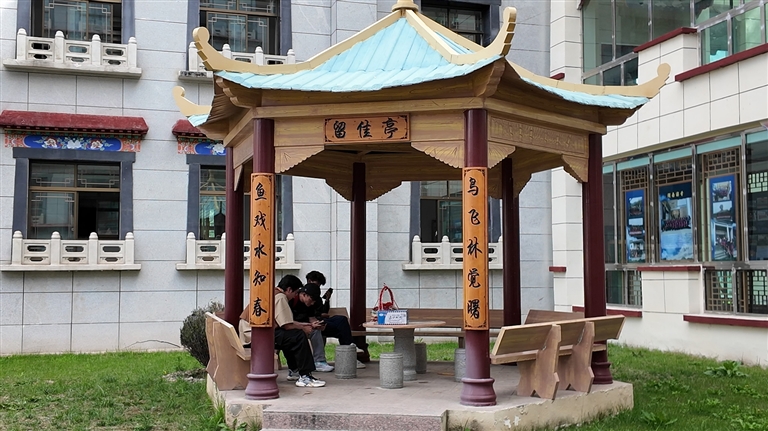 學生正在校園內(nei) 的涼亭裏讀書(shu) 。