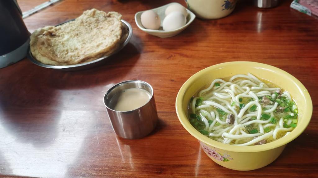 藏麵的經典套餐中還包括牛肉油餅、雞蛋和甜茶。新華社記者魏冠宇 攝