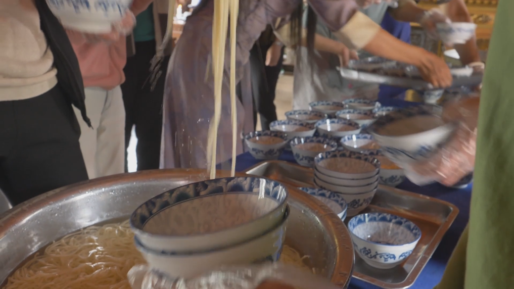 遊客的手機、相機鏡頭嚴(yan) 陣以待,小碗橫排豎列擺滿一桌,七八位廚娘麻利撈麵,最終在每個(ge) 碗中盛下三五根麵、一口湯。
