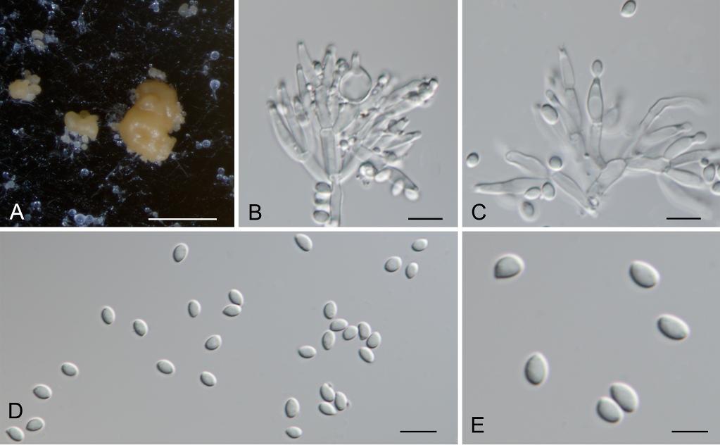 西藏螺旋聚孢黴的形態。A:PDA上形成的分生孢子團,B、C:產(chan) 孢細胞及初生的分生孢子,D、E:分生孢子。標尺A=300μm;B-E=10μm。(西藏自治區生態環境廳供圖)