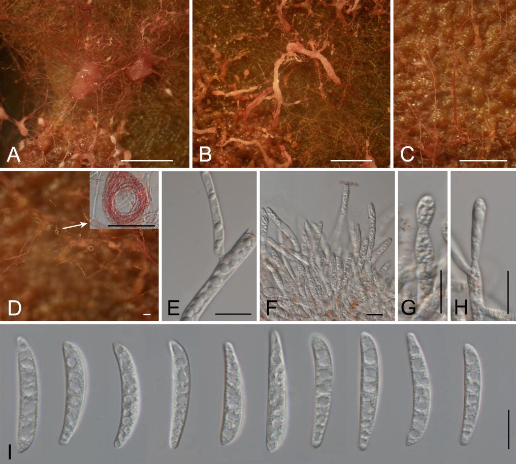 西藏梭孢菌的形態。A、B:PDA上形成的分生孢子團,C:紅色的菌絲(si) ,D:菌絲(si) 結環,E:透明的菌絲(si) ,F-H:產(chan) 孢細胞及初生的分生孢子,I:分生孢子。標尺A-C=500μm;D=50μm;E-I=10μm。(西藏自治區生態環境廳供圖)