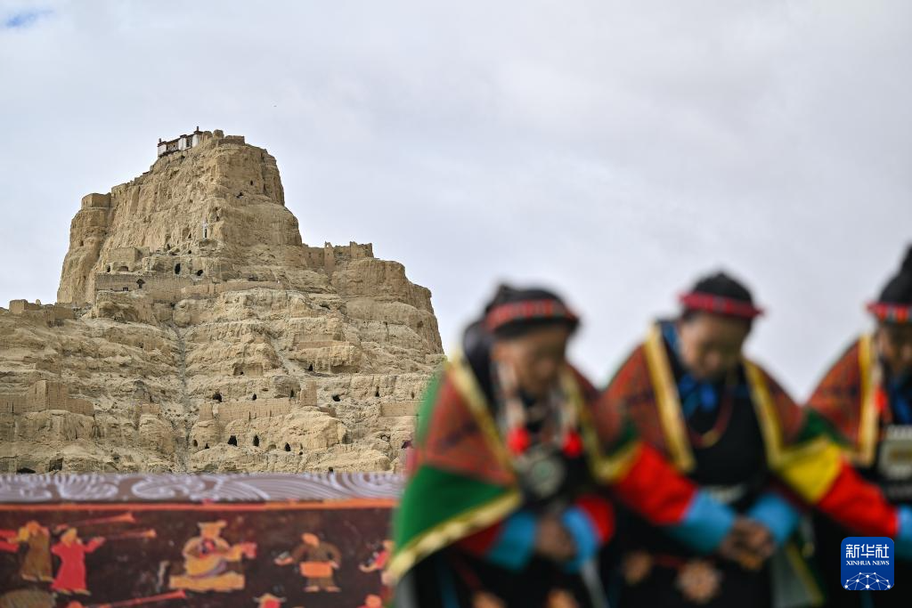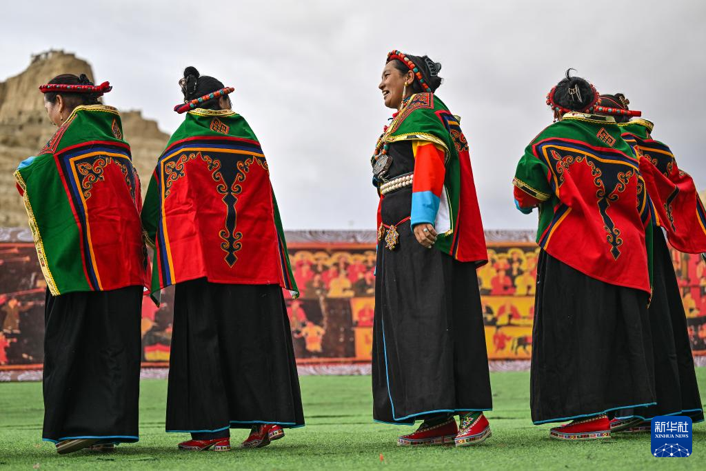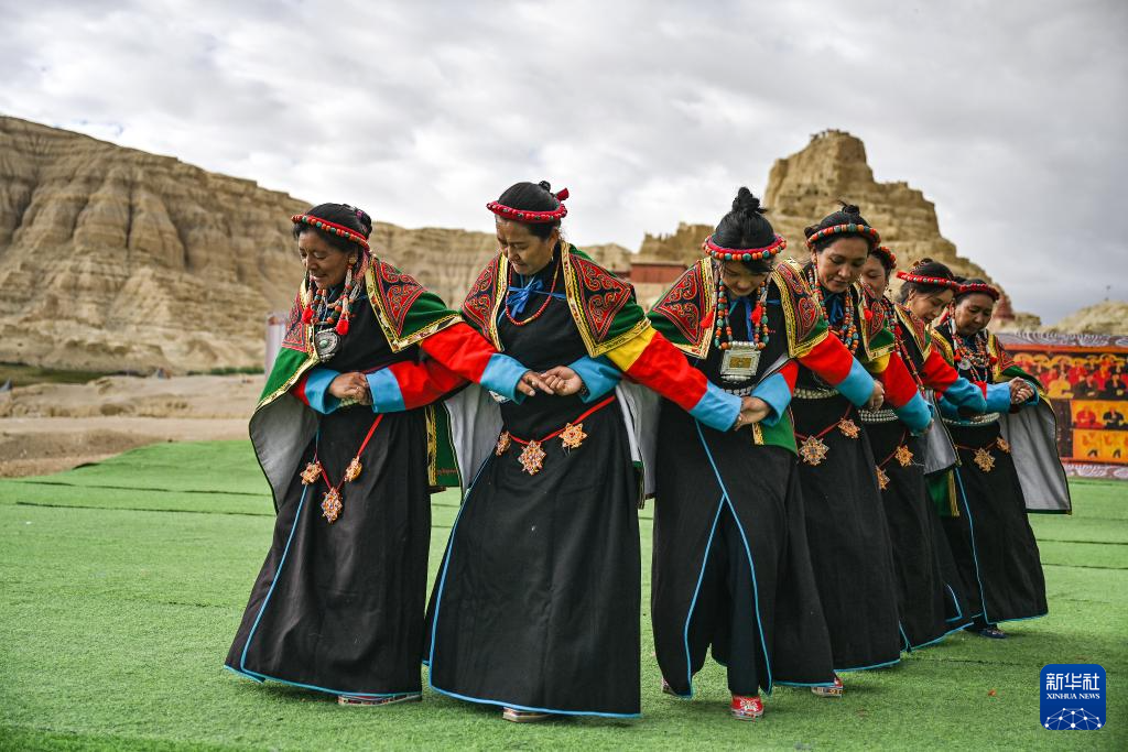 在西藏阿裏地區劄達縣古格王國遺址腳下,當地村民表演“宣舞”(9月11日攝)。新華社記者 孫瑞博 攝