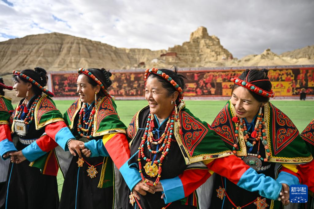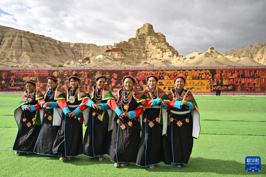 在西藏阿裏地區劄達縣古格王國遺址腳下,當地村民表演“宣舞”後互相交流(9月11日攝)。新華社記者 孫瑞博 攝