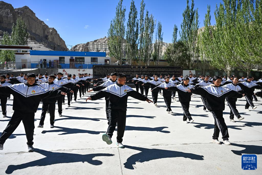 在西藏阿裏地區劄達縣九年一貫製學校,學生們(men) 跳起融入“宣舞”特色的課間操(9月10日攝)。新華社記者 孫瑞博 攝