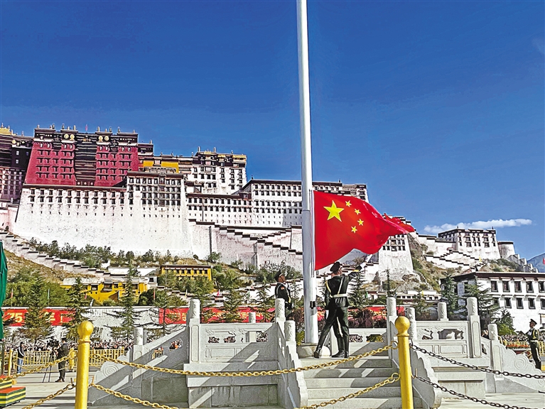 節日的布達拉宮廣場花團錦簇,處處洋溢著濃濃的歡樂(le) 喜慶氣氛。熱烈慶祝中華人民共和國成立75周年的標語格外醒目。上午10時許,升旗儀(yi) 式正式開始。英姿勃發的國旗護衛隊邁著鏗鏘有力、整齊劃一的步伐,莊嚴(yan) 地護衛國旗走向升旗台。“起來!不願做奴隸的人們(men) !把我們(men) 的血肉,築成我們(men) 新的長城……”伴隨著雄壯激昂的國歌,升旗手振臂一揮,鮮豔的五星紅旗冉冉升起。現場各界人士向國旗行注目禮,深情凝望國旗,高唱國歌,表達對黨(dang) 的崇高敬意、對偉(wei) 大祖國的深切祝福。