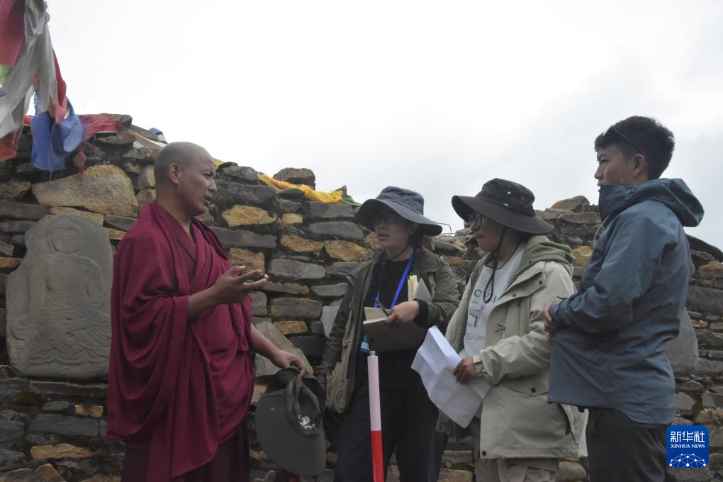 普查隊員正在向了解當地曆史文化的僧人谘詢塔巴遺址曆史沿革。新華社記者 春拉 攝