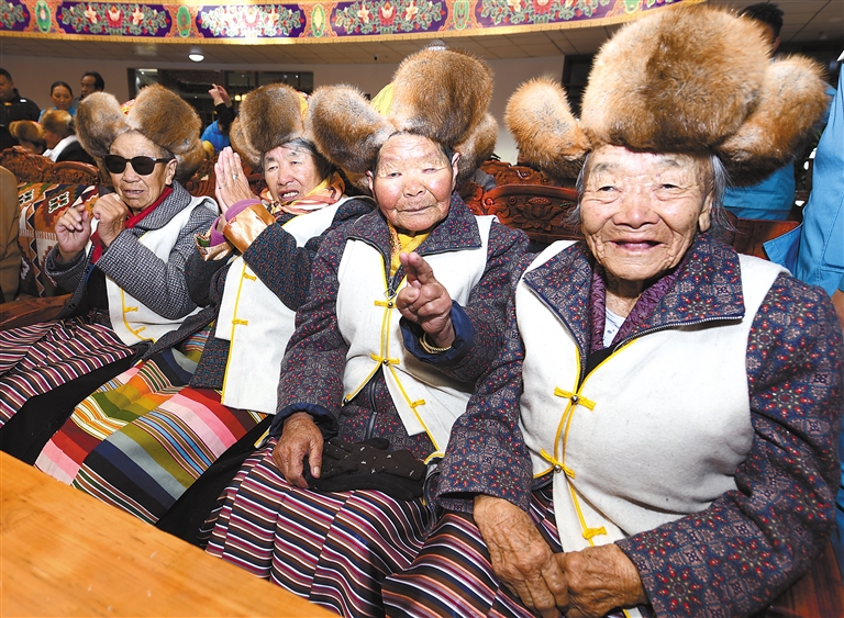 圖為(wei) 拉薩市社會(hui) 福利院的老人們(men) 圍坐在一起歡度重陽節。記者 唐斌 攝
