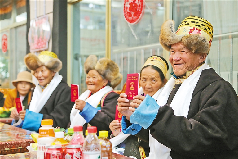 圖為(wei) 山南市瓊結縣特困人員集中供養(yang) 服務中心的“新人”阿南高興(xing) 地展示自己的結婚證。記者 白瑪澤旺 通訊員 倫(lun) 珠澤旺 攝