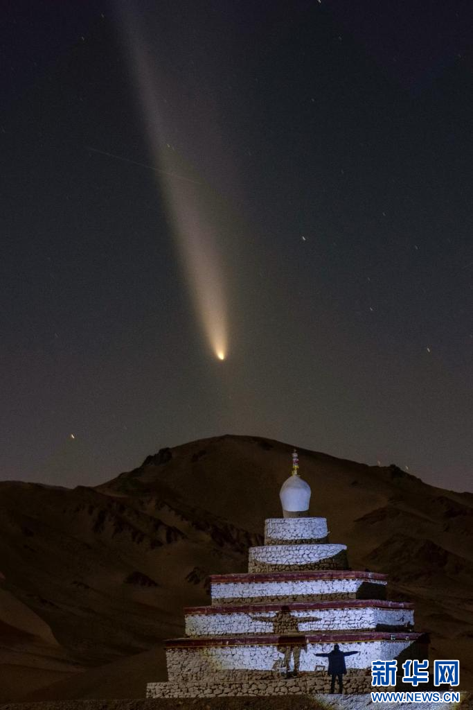 10月13日,在西藏阿裏地區獅泉河鎮熱拉紅堡白塔拍攝的彗星。新華網發 曹枝清攝