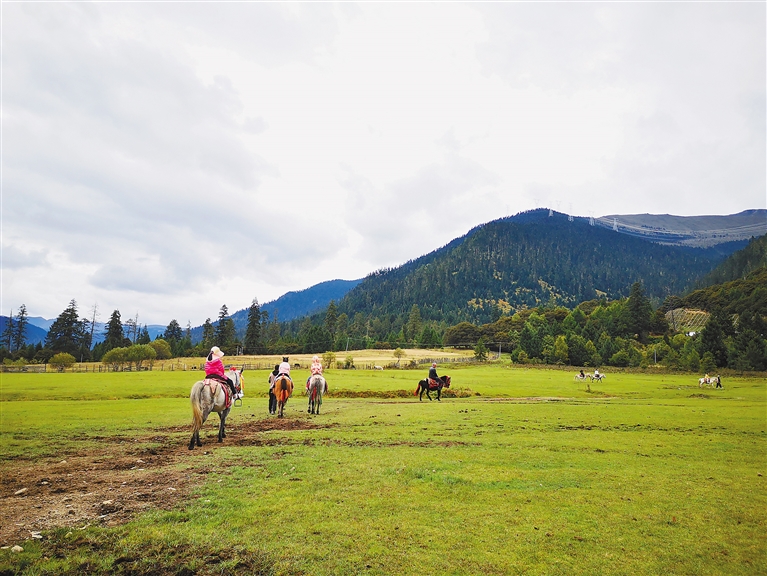 遊客在林芝市魯朗小鎮體(ti) 驗騎馬。記者 周輝 攝