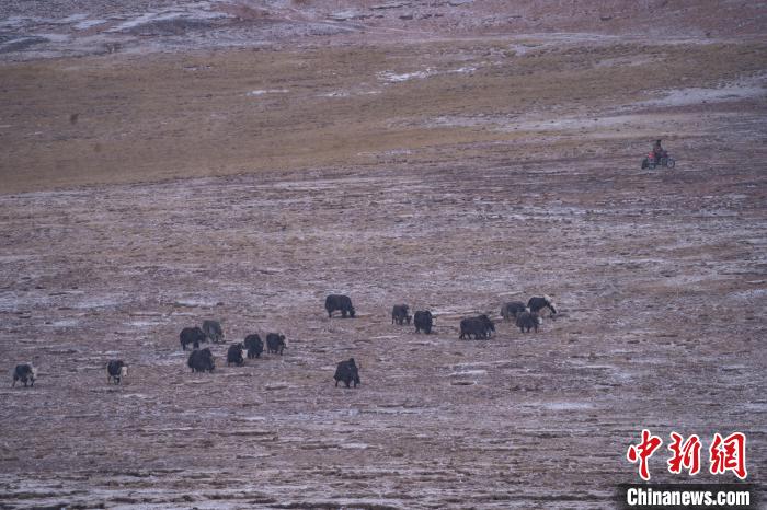 10月23日,西藏自治區那曲市安多縣多瑪鄉(xiang) 牧民在雪中放牧。當日,一場雪將藏北草原裝扮得如詩如畫。牧民們(men) 在這銀裝素裹的天地間,開始了雪中放牧的生活。牛羊在雪地中悠閑覓食,牧民駕駛著摩托車,在雪中放牧,形成了一幅動人的風景畫。圖為(wei) 犛牛在草原上覓食。中新社記者 貢嘎來鬆 攝