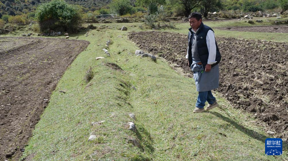 10月21日,忠玉村黨(dang) 支部書(shu) 記才旺多吉查看土石夯成的老水渠。新華社記者魏冠宇 攝