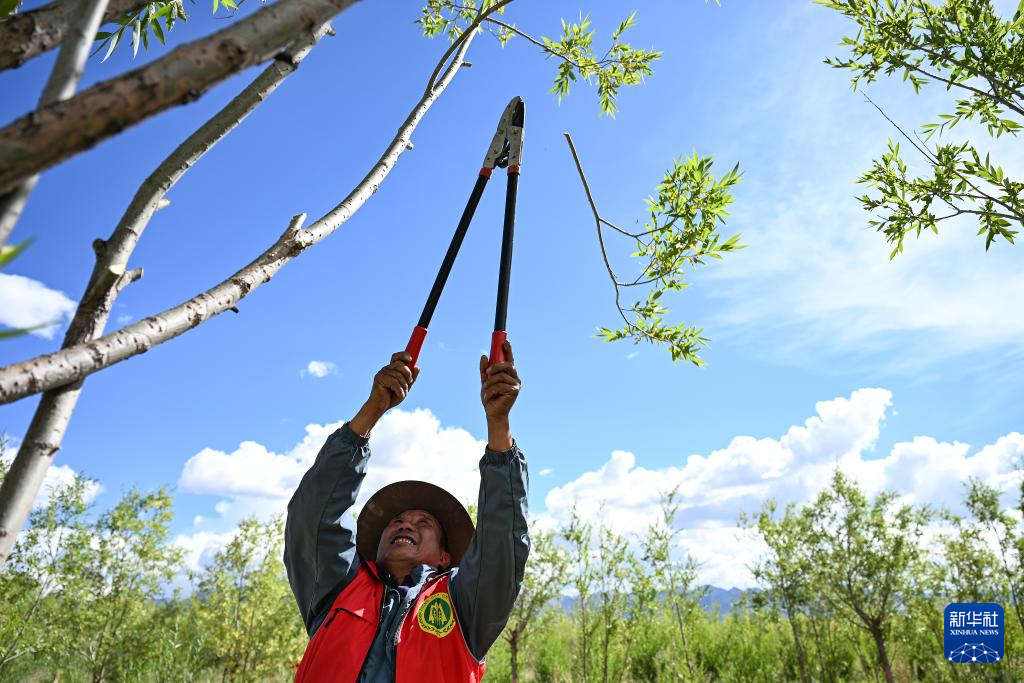 在雅江北岸南木林生態示範區,當地護林員在修剪林木(2024年9月1日攝)。新華社記者 孫瑞博 攝