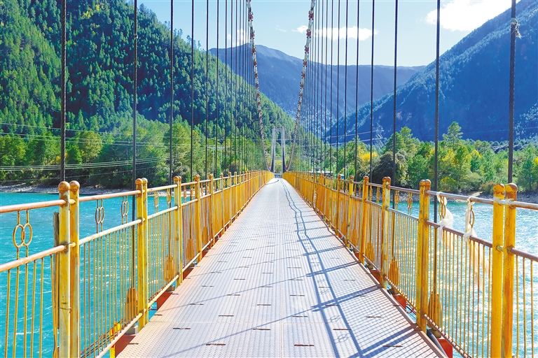 “從(cong) 鎮上到村裏要經過章白吊橋,特別狹窄,一次隻能過一輛車。本來是製約村裏交通的一座吊橋,但因為(wei) 兩(liang) 側(ce) 風景美麗(li) ,現在反而成了許多營地遊客點名要去打卡拍照的地方。”在帳篷營地務工的百巴村村民多傑旺紮說。