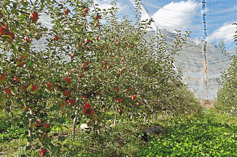 矮砧寬行密植的蘋果樹被劃分成一個(ge) 個(ge) 區域。“這是我們(men) 的多功能網室,是一種以高密度聚乙烯為(wei) 主料的防護網。能抗大風,減少冰雹、暴曬等惡劣天氣帶來的影響。”增巴村蘋果種植基地技術員劉傳(chuan) 海介紹道。