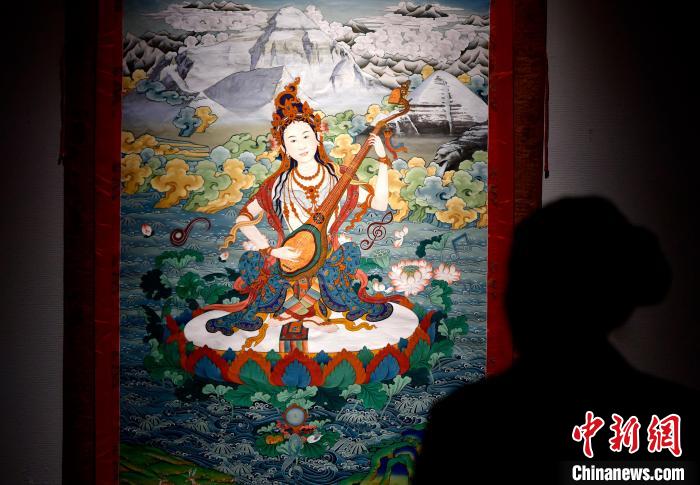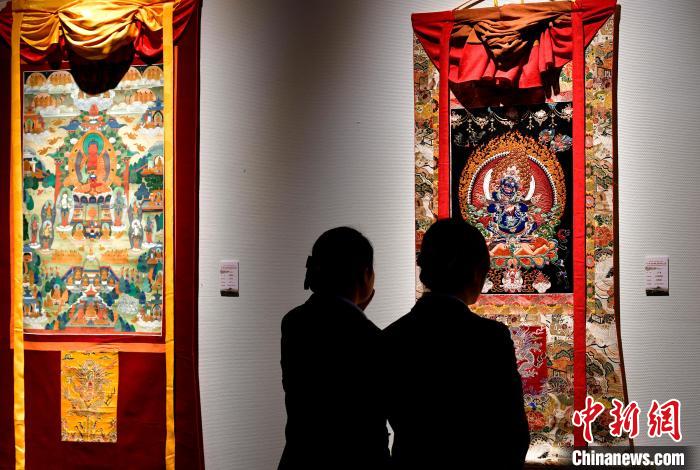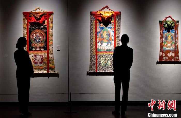 圖為(wei) 觀眾(zhong) 欣賞展覽中的唐卡作品。中新社記者 李林 攝