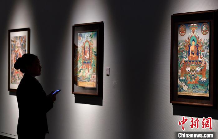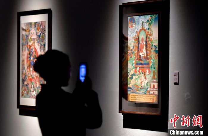 圖為(wei) 觀眾(zhong) 拍攝展覽中的唐卡作品。中新社記者 李林 攝