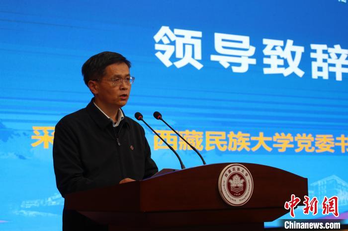 西藏民族大學黨(dang) 委書(shu) 記、副校長采守寬在第四屆“藏秦·喜馬拉雅”論壇開幕式發表致辭。主辦方供圖