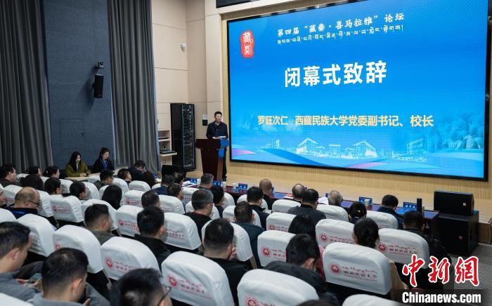 西藏民族大學黨(dang) 委副書(shu) 記、校長羅旺次仁在第四屆“藏秦·喜馬拉雅”論壇閉幕式上發表致辭。主辦方供圖
