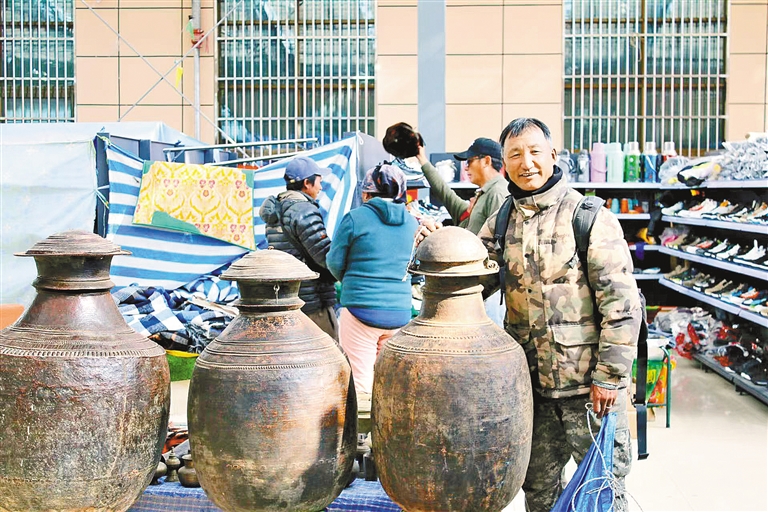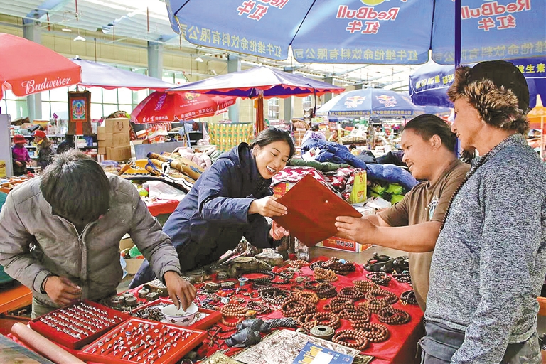 尼泊爾商戶加央在裏孜口岸臨(lin) 時交易市場。通訊員 西繞拉珍 記者 頓珠紮西 攝