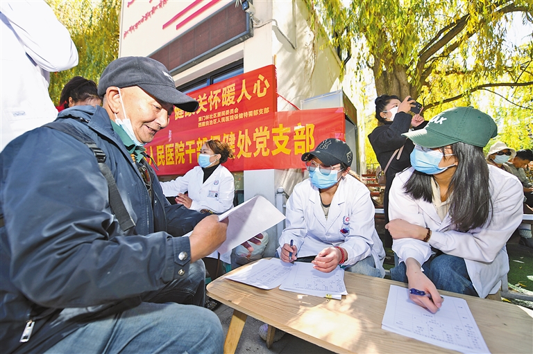 拉薩市策門林社區居民委員會(hui) 聯合自治區人民醫院幹部保健處黨(dang) 支部在宗角祿康公園開展義(yi) 診活動。記者 唐斌 攝