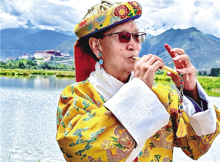 鷹笛是來自於(yu) 大自然的樂(le) 器,吹奏出的每個(ge) 音符蘊含了大自然的靈性。笛聲如同在天空中任意翱翔的雄鷹,高亢且空靈,似乎在訴說著千年的傳(chuan) 奇。今年74歲的次旦,是國家一級演奏員,也是自治區級藏族鷹笛藝術非物質文化遺產(chan) 代表性傳(chuan) 承人。次旦老師從(cong) 小和鷹笛結下了不解之緣,並立誌要將藏族鷹笛藝術發揚光大。如今,退休在家的次旦老師依舊奔忙在傳(chuan) 播藏族鷹笛藝術的工作中,為(wei) 傳(chuan) 承“非遺”貢獻著自己的力量。