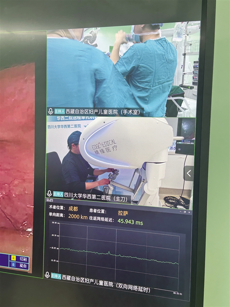 梅玲介紹,此次手術是與(yu) 四川大學華西第二醫院聯合開展的,由四川大學華西第二醫院的鄭瑩教授團隊主刀,並依托華西的先進技術平台,通過遠程方式完成手術。手術結束後,鄭瑩教授通過視頻向大家介紹,這場跨越2000公裏距離與(yu) 3000米海拔差異的手術,總共用時1小時45分鍾,網絡延遲僅(jin) 40毫秒。“此次手術的成功為(wei) 今後更多優(you) 質資源技術送達偏遠地區提供了重要參考,也為(wei) 提高西藏醫療水平打下了堅實的基礎。”鄭瑩說。
