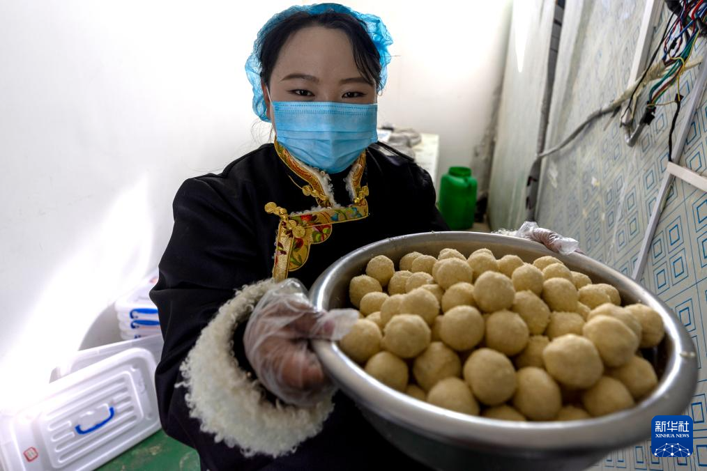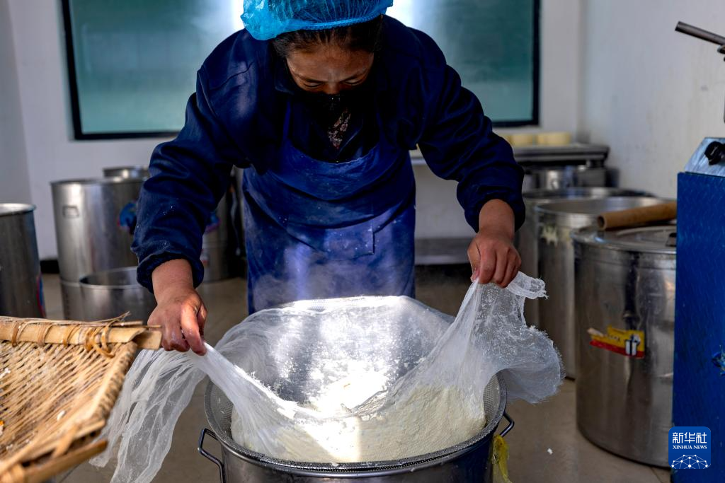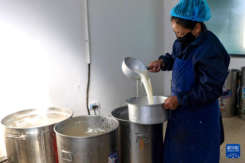 11月28日,在基地就業(ye) 的當地員工索朗卓瑪在用傳(chuan) 統工藝製作奶渣。新華社記者 薑帆 攝