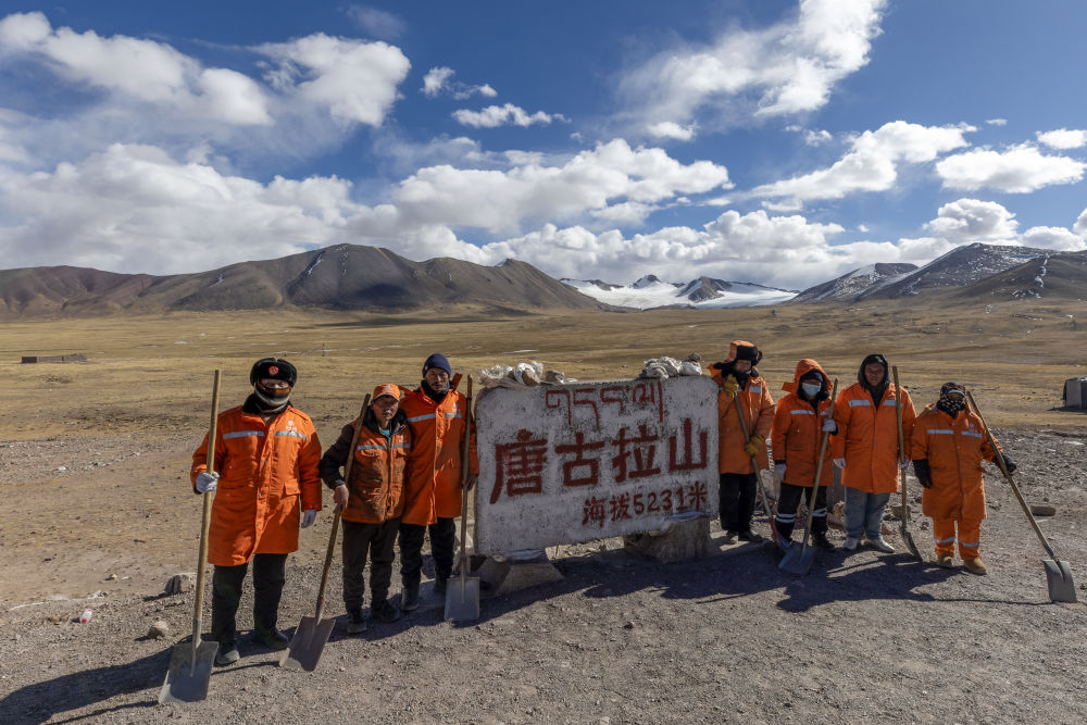 記者一行到達唐古拉山口時,7名身穿橙色製服的養(yang) 路工人,正在用鐵鍬修補路肩。盡管太陽高懸,風速卻不小,用來警示隔離的錐形交通路標不斷被大風吹倒,工人們(men) 不時要把它們(men) 扶正。