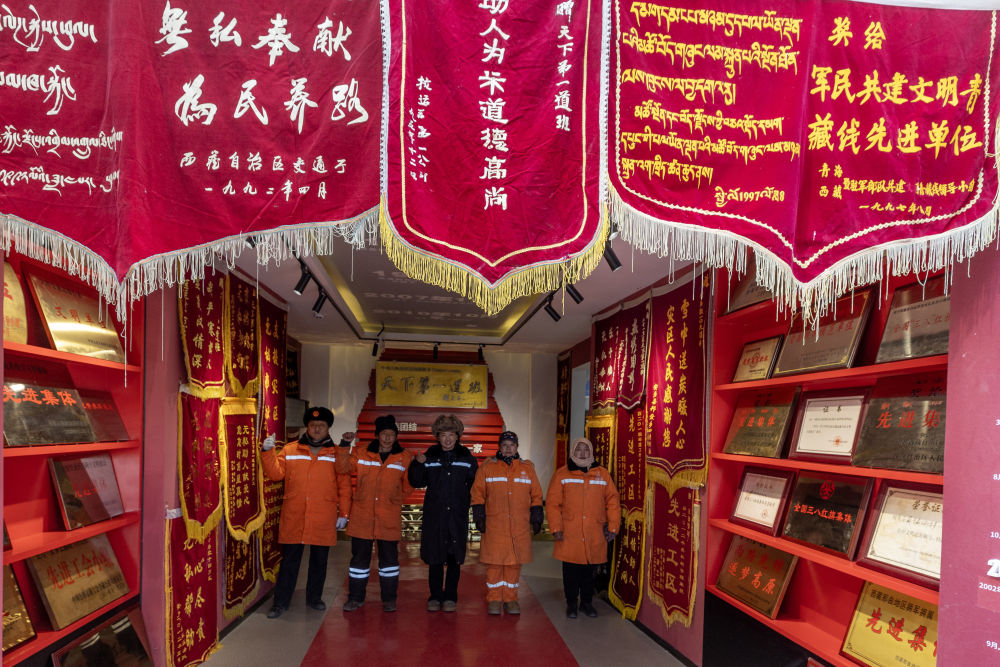 養(yang) 路工人在“天下第一道班”紀念館內(nei) 合影(12月1日攝)。新華社記者 薑帆 攝