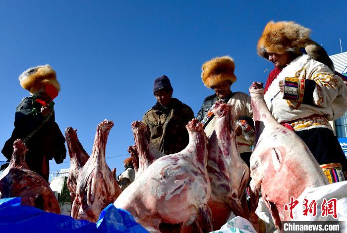 12月6日,西藏自治區那曲市申紮縣第十八屆畜產(chan) 品展銷會(hui) 現場,民眾(zhong) 挑選羊肉。 李林 攝