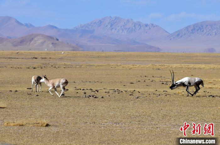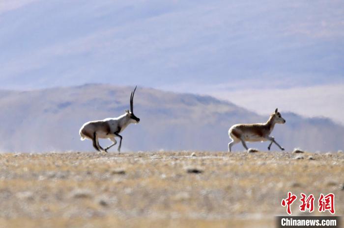 圖為(wei) 12月8日,棲息在魯確塘草原的雄性藏羚羊正在追逐雌性藏羚羊。中新社記者 李林 攝