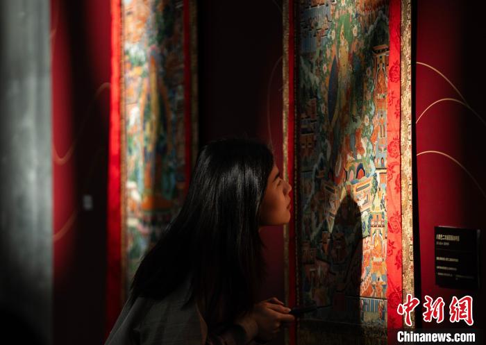 12月9日,“江河匯流 遍弘海內(nei) ”西藏日喀則薩迦唐卡藝術展在香港西九龍高鐵站紫荊藝術展演空間揭幕,展覽首次向香港市民遊客展示明代《八思巴畫傳(chuan) 》中部分唐卡藝術品的藝術微噴摹品,展現日喀則的文化底蘊。當天,“珠峰之鄉(xiang) 情耀香江”日喀則招商引資和文旅推介活動也同步舉(ju) 行。圖為(wei) 來賓參觀精美的唐卡摹品。中新網記者 侯宇 攝