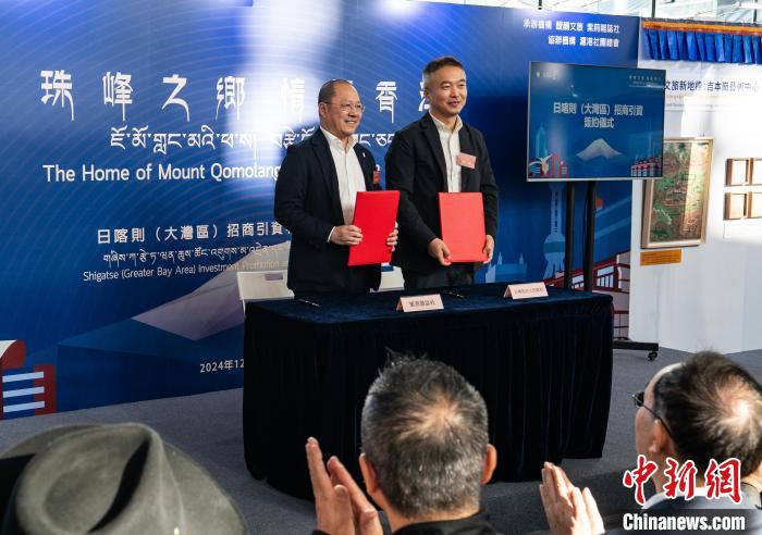 圖為(wei) 日喀則市委副書(shu) 記、常務副市長彭一浩(右)和紫荊雜誌社總編輯袁建簽署招商引資協議。中新網記者 侯宇 攝