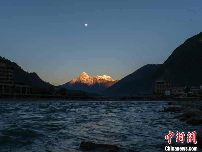 12月17日清晨日出時分,西藏波密縣出現“日照金山”與(yu) 月亮同框的景色。中新社記者 江飛波 攝