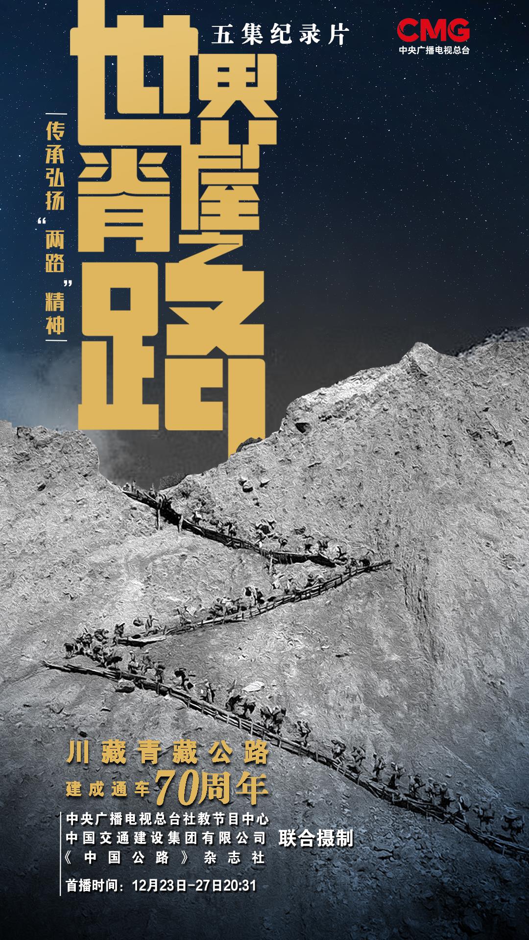 12月23日至27日,五集紀錄片《世界屋脊之路——川藏、青藏公路建成通車70周年》央視科教頻道(CCTV-10)每晚20:31播出。央視網、央視頻、央視科教新媒體(ti) 矩陣同步播出。