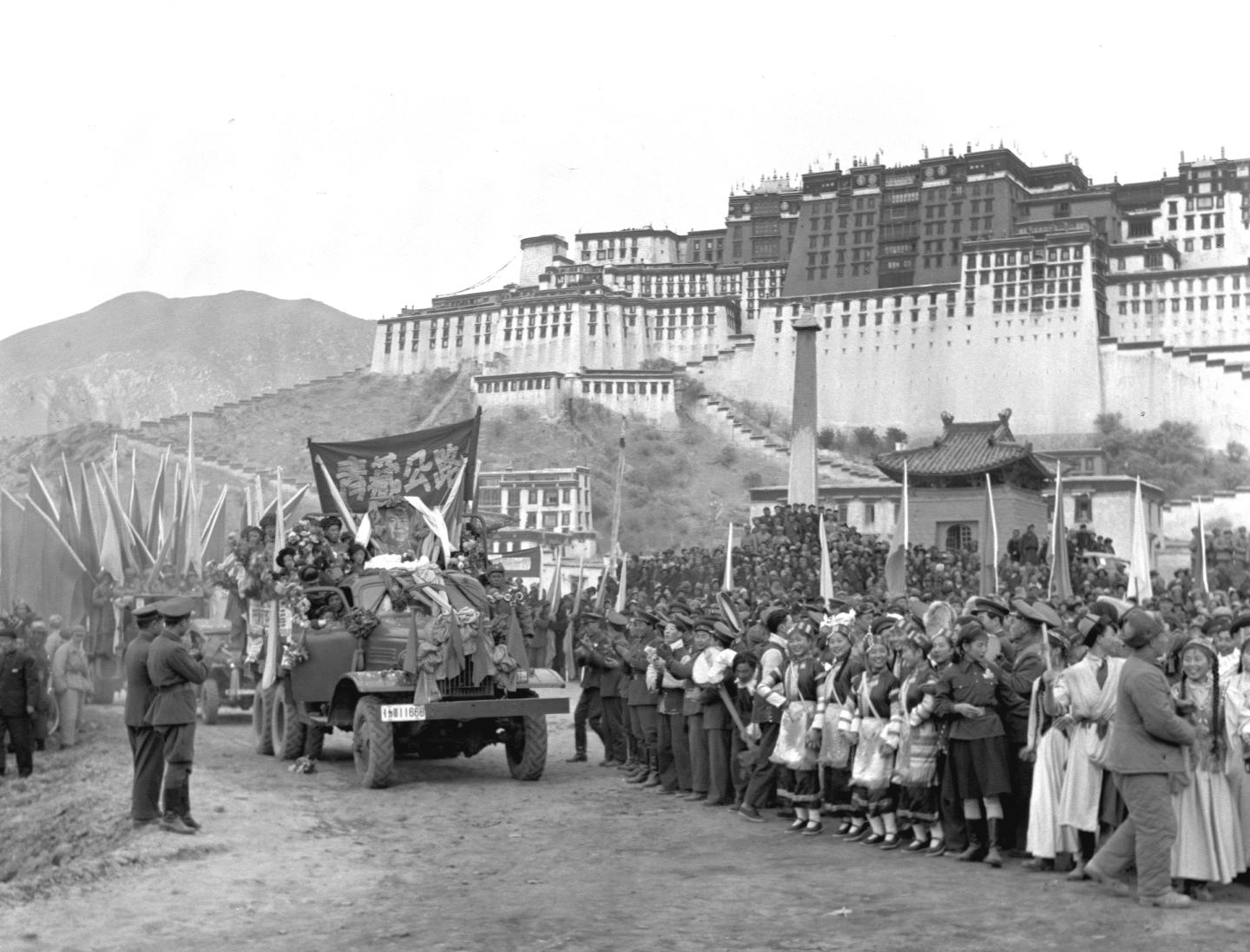 1954年12月25日,在西藏拉薩布達拉宮前舉(ju) 行的通車典禮上,拉薩市群眾(zhong) 歡迎從(cong) 青藏公路開到拉薩的汽車隊。