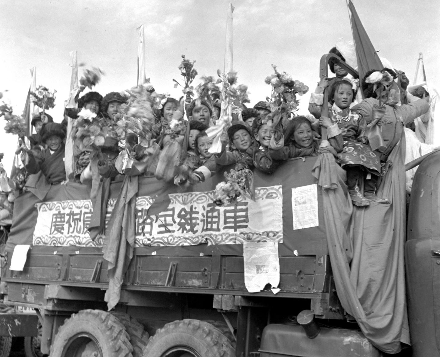 1954年12月25日,參加川藏、青藏公路通車典禮的藏族少年在拉薩愉快地乘上汽車。