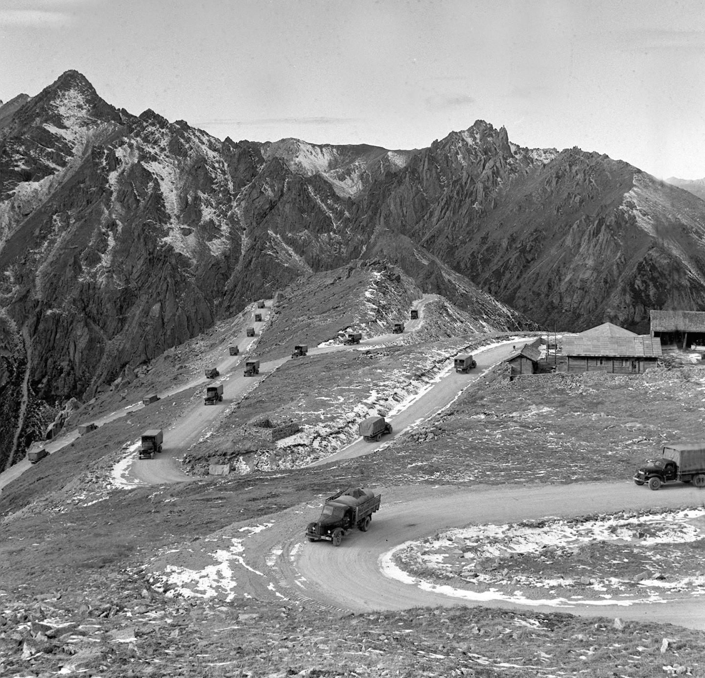 1964年,滿載建設物資的汽車隊行駛在川藏公路途中的雀兒(er) 山上。