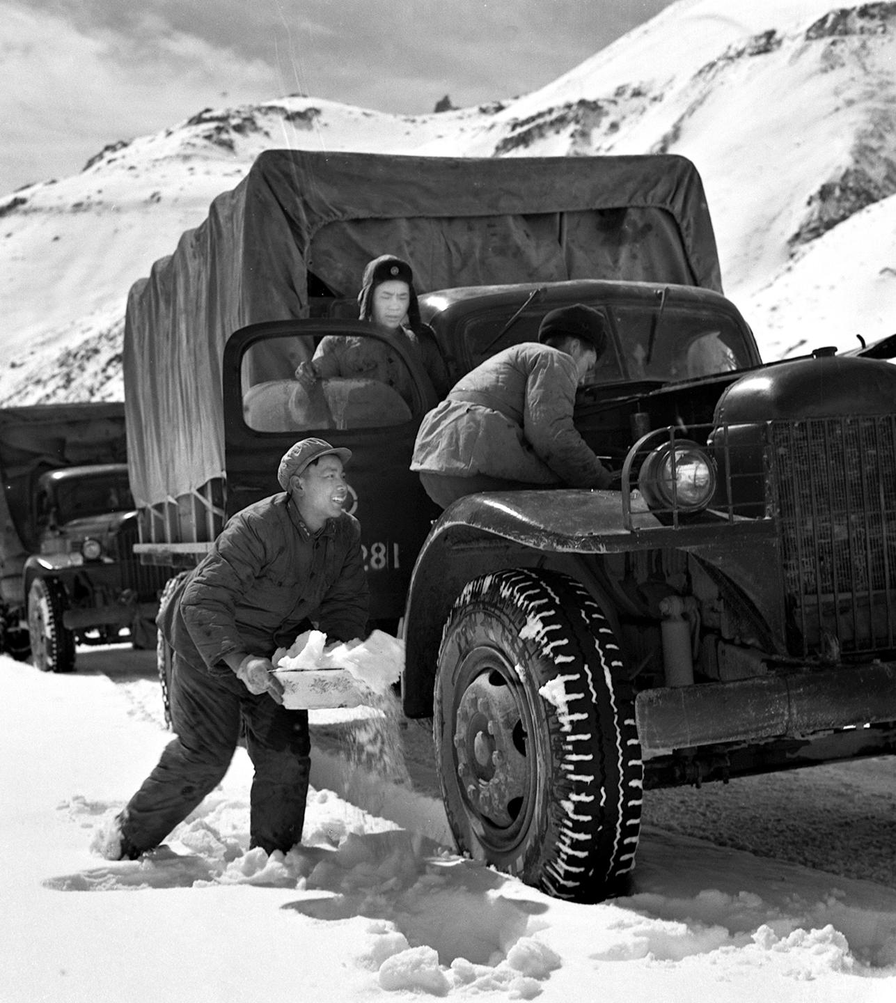 1964年,解放軍(jun) 一個(ge) 汽車連隊的駕駛員在川藏公路上用洗臉盆端雪去冷卻油泵。