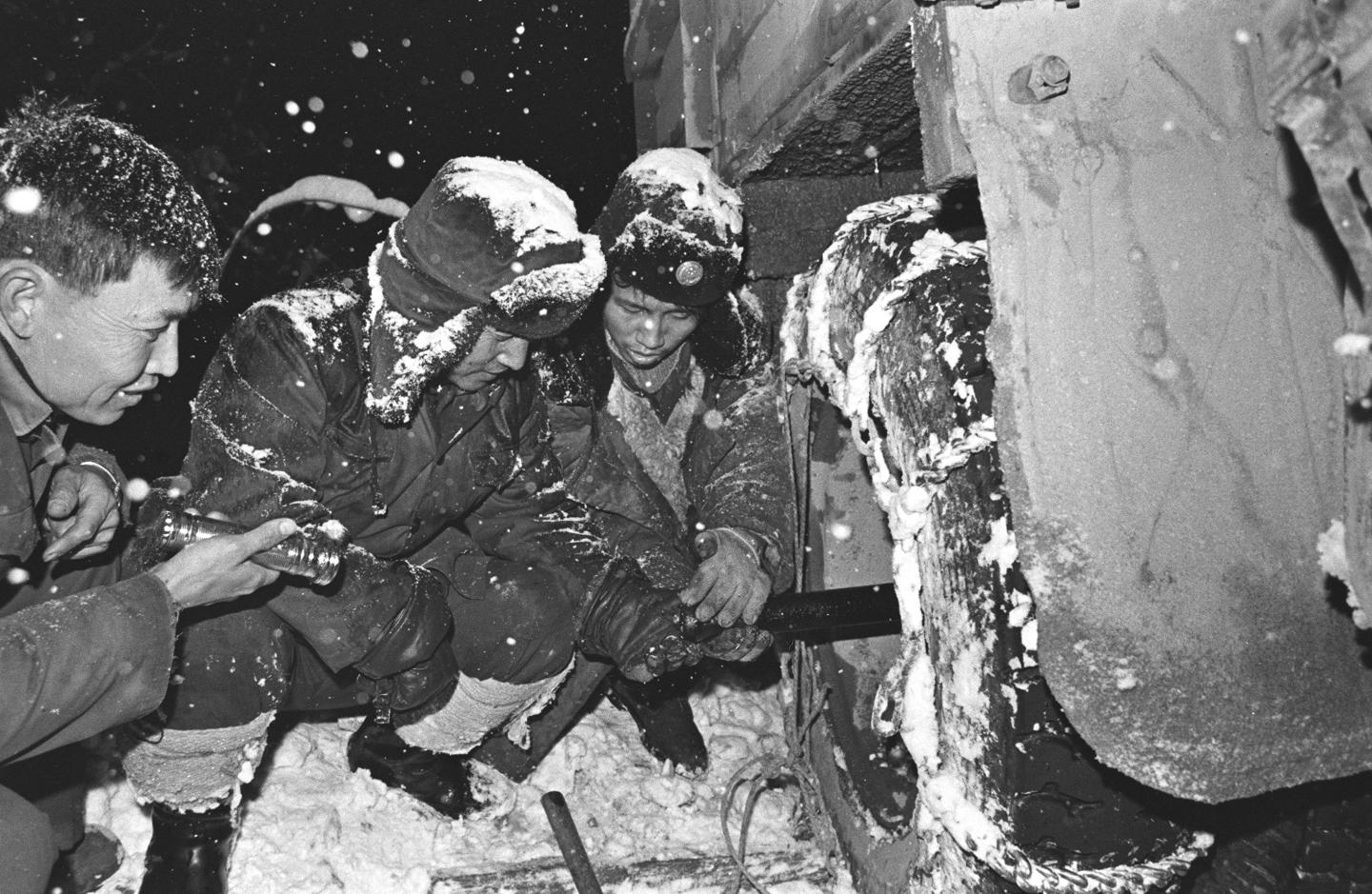 1985年3月中旬的一場罕見大雪中,川藏公路二郎山交通安全管理小組成員連夜搶修滿載援藏物資的運輸車輛。
