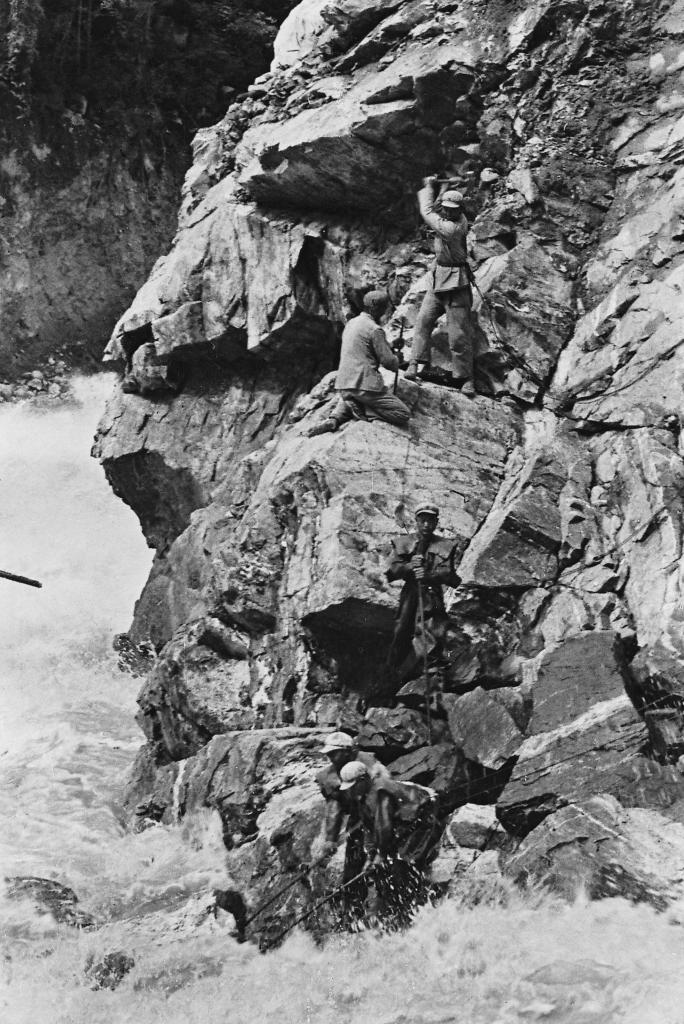 1953年,修築川藏公路的解放軍(jun) 戰士在懸崖上勞動。