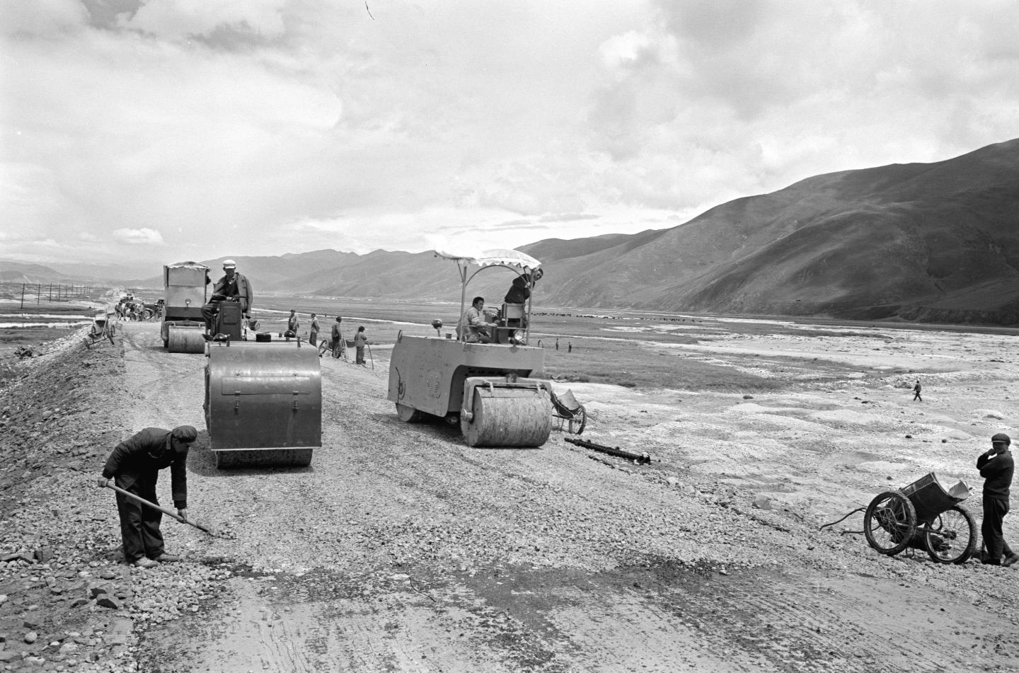 1979年,工人們(men) 在藏北高原上施工,為(wei) 青藏公路鋪設柏油路麵。
