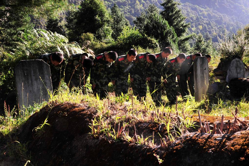 2014年9月18日,武警交通二支隊的官兵在波密縣烈士陵園祭奠烈士。在川藏公路沿線的許多地方,都有為(wei) 當年築路部隊和當代護路部隊因公犧牲的烈士所建的陵園。