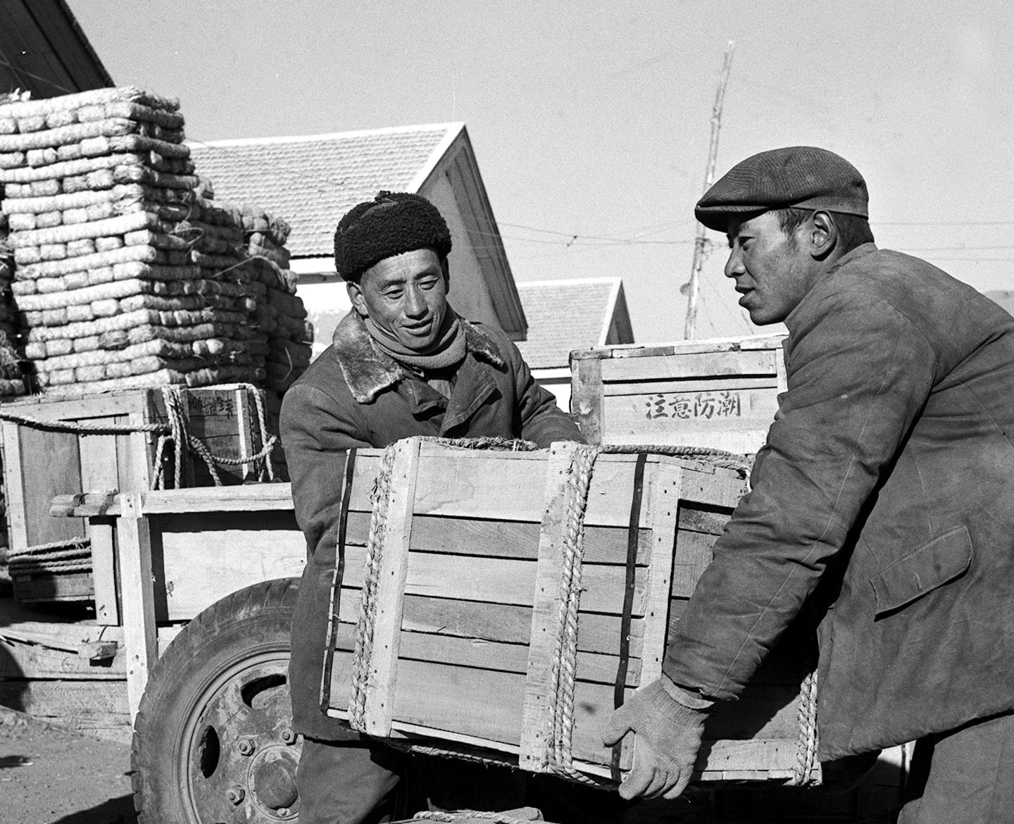 1964年,西藏山南貿易部門的工作人員在卸貨。不少生活用品沿著青藏公路和川藏公路源源運進西藏。