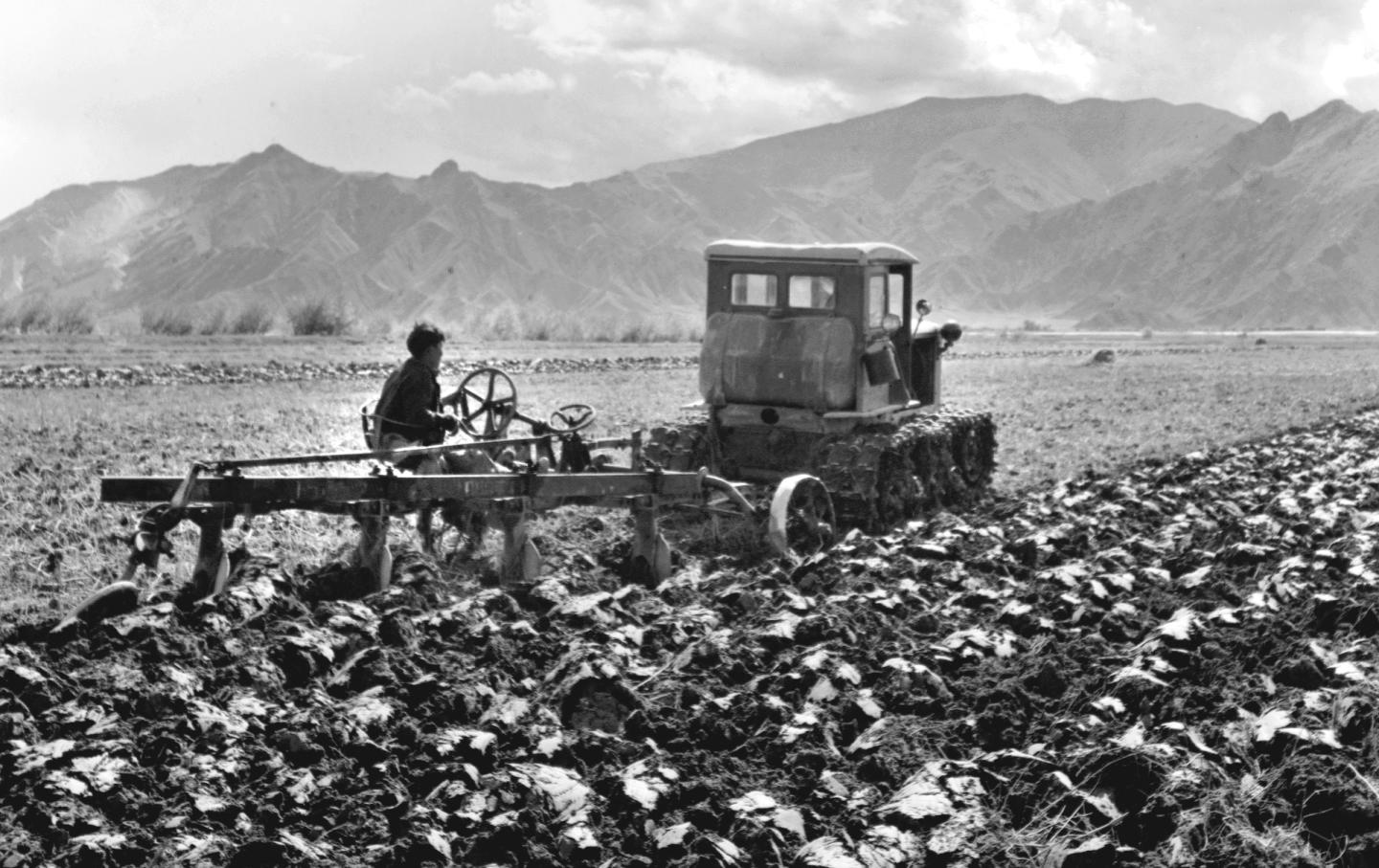 1964年,農(nong) 民使用拖拉機在拉薩郊外進行秋耕。青藏公路和川藏公路通車後,許多新式農(nong) 具通過公路運到了西藏。