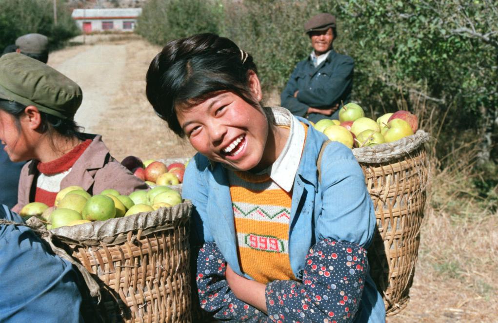 1990年,川藏公路附近,藏族女青年在背運蘋果。